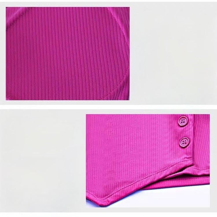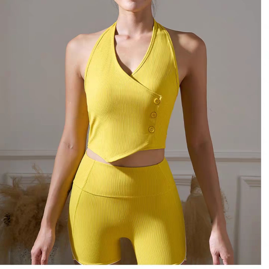 個性を引き立てるアシンメトリーデザインとサイドボタンが印象的なホルターネックトップス。