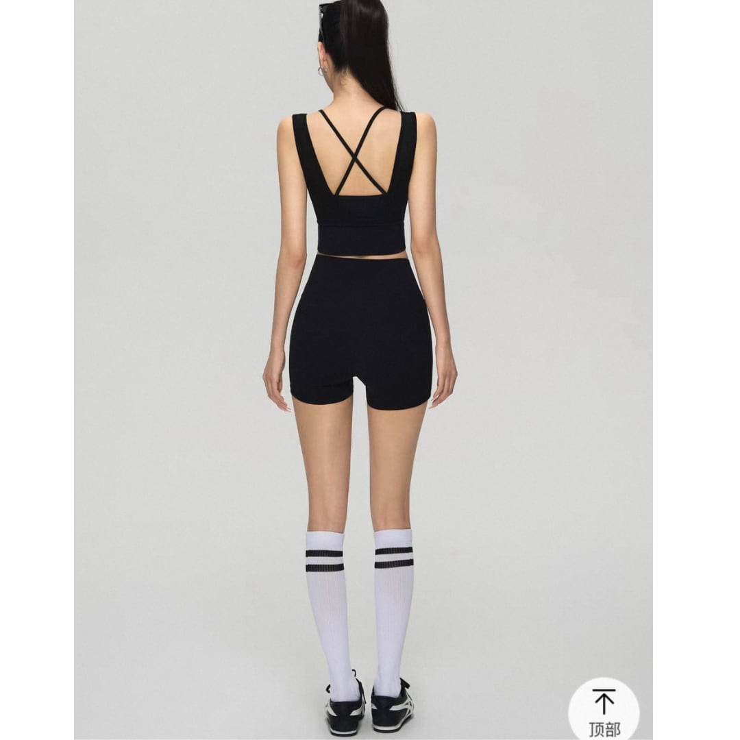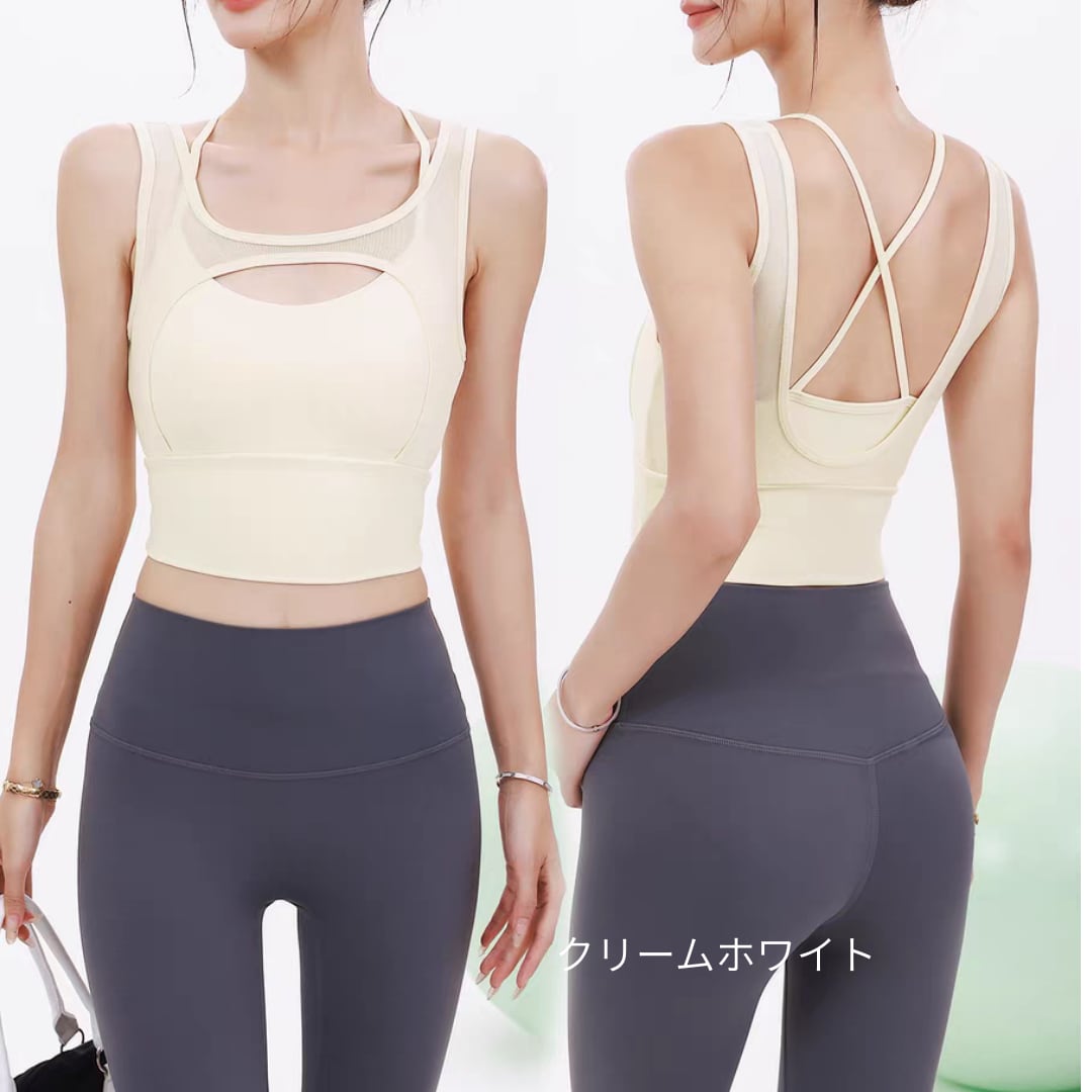 バックスタイルを美しく見せるクロスストラップが特徴のスポーツブラトップ。