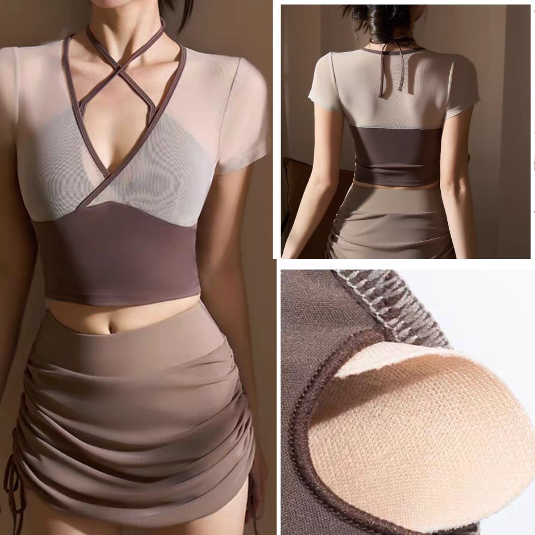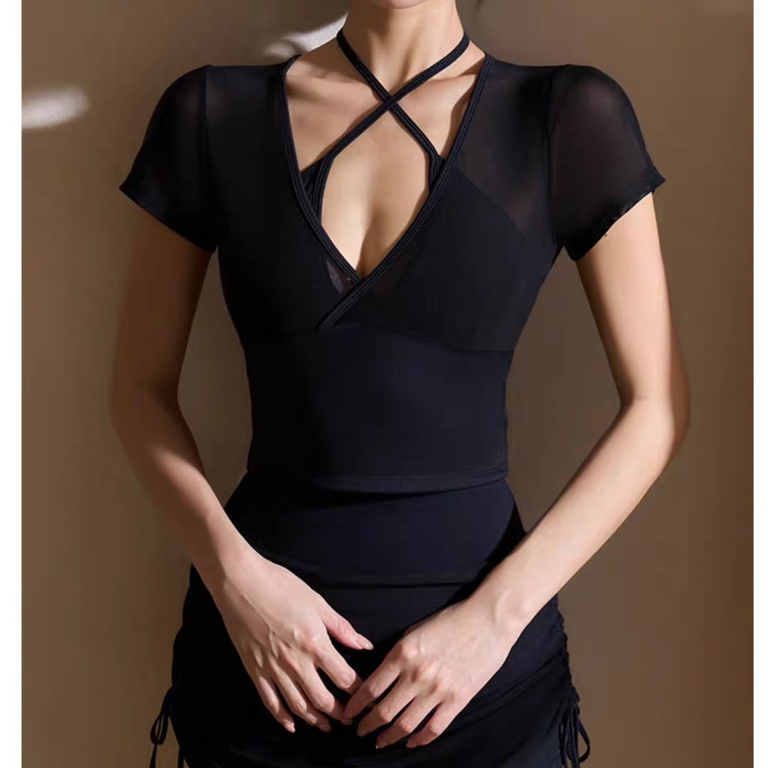 デコルテを美しく見せるクロスストラップデザインと、透け感のあるシアー素材が魅力のショートトップス。