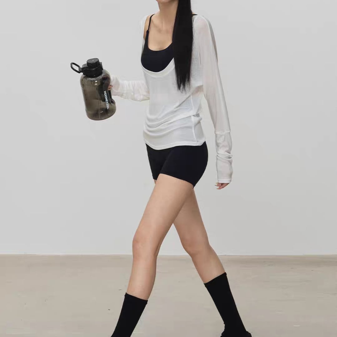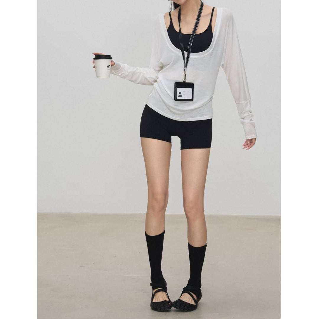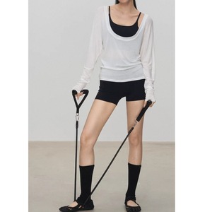 ヒップラインをカバーする少し長めの丈感で、レッスン後のリラックスタイムにも◎