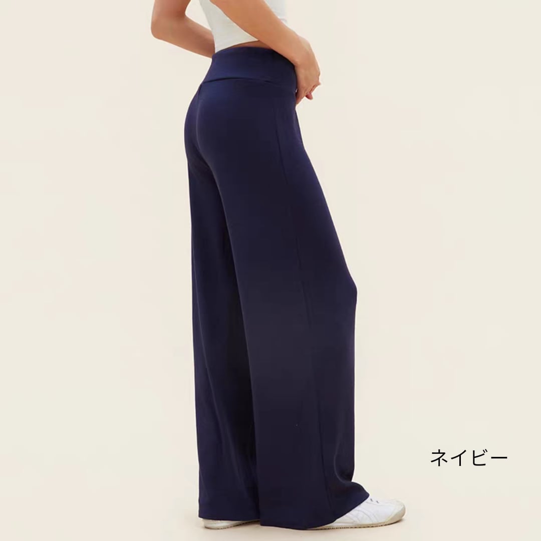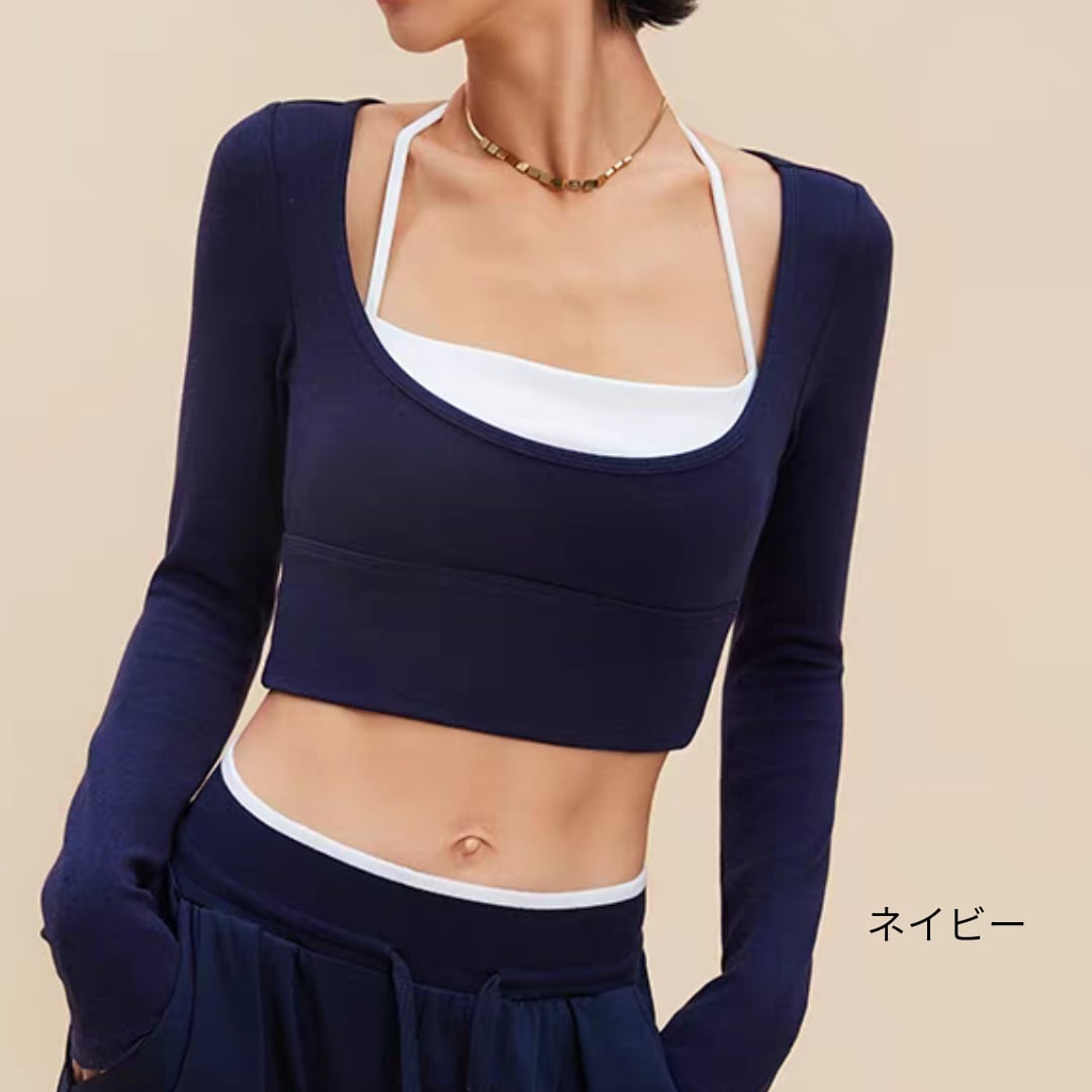 トップスはデコルテを美しく見せるスクエアネック、パンツは脚長効果のあるフレアラインで、身体の動きと女性らしさを引き立てます。