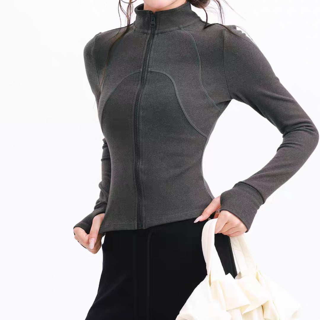 親指ホール付きで手元まであたたかく、温度調節しやすいフルジップタイプ。