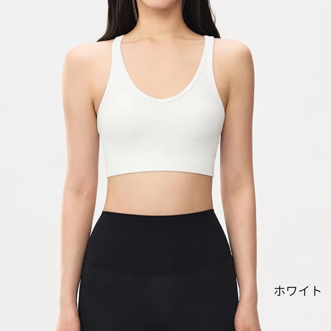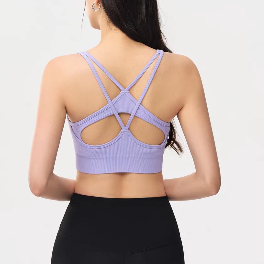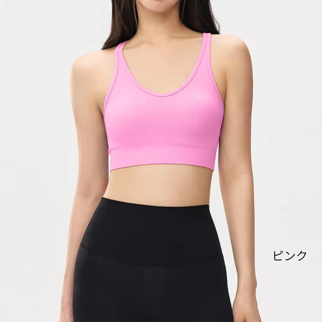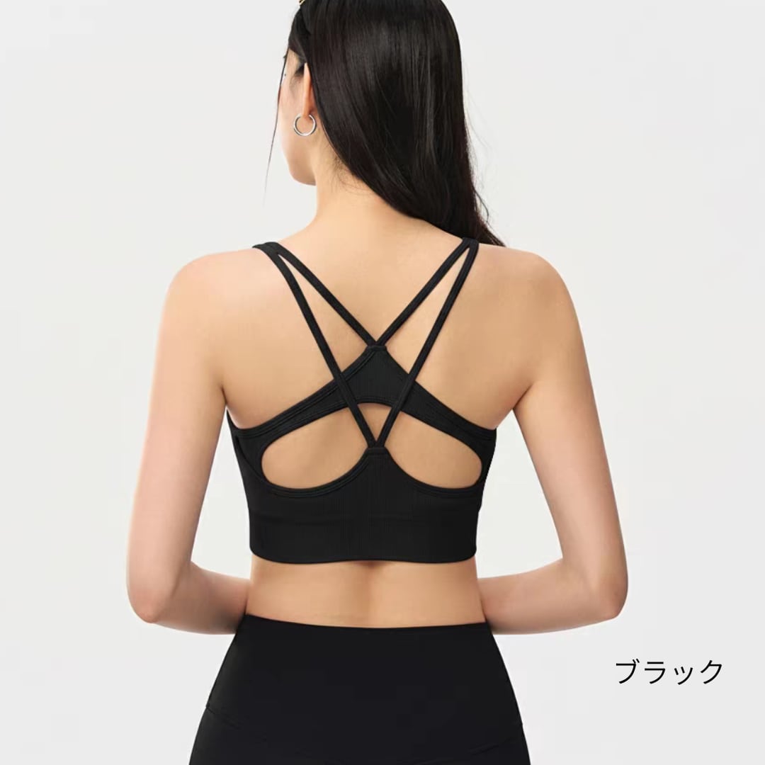 シンプルなフロントデザインに、背中を美しく見せるクロスストラップを組み合わせたリブ素材のスポーツブラ。