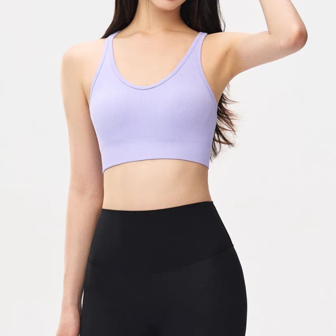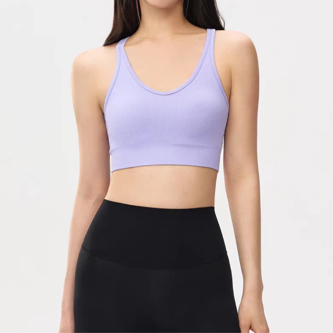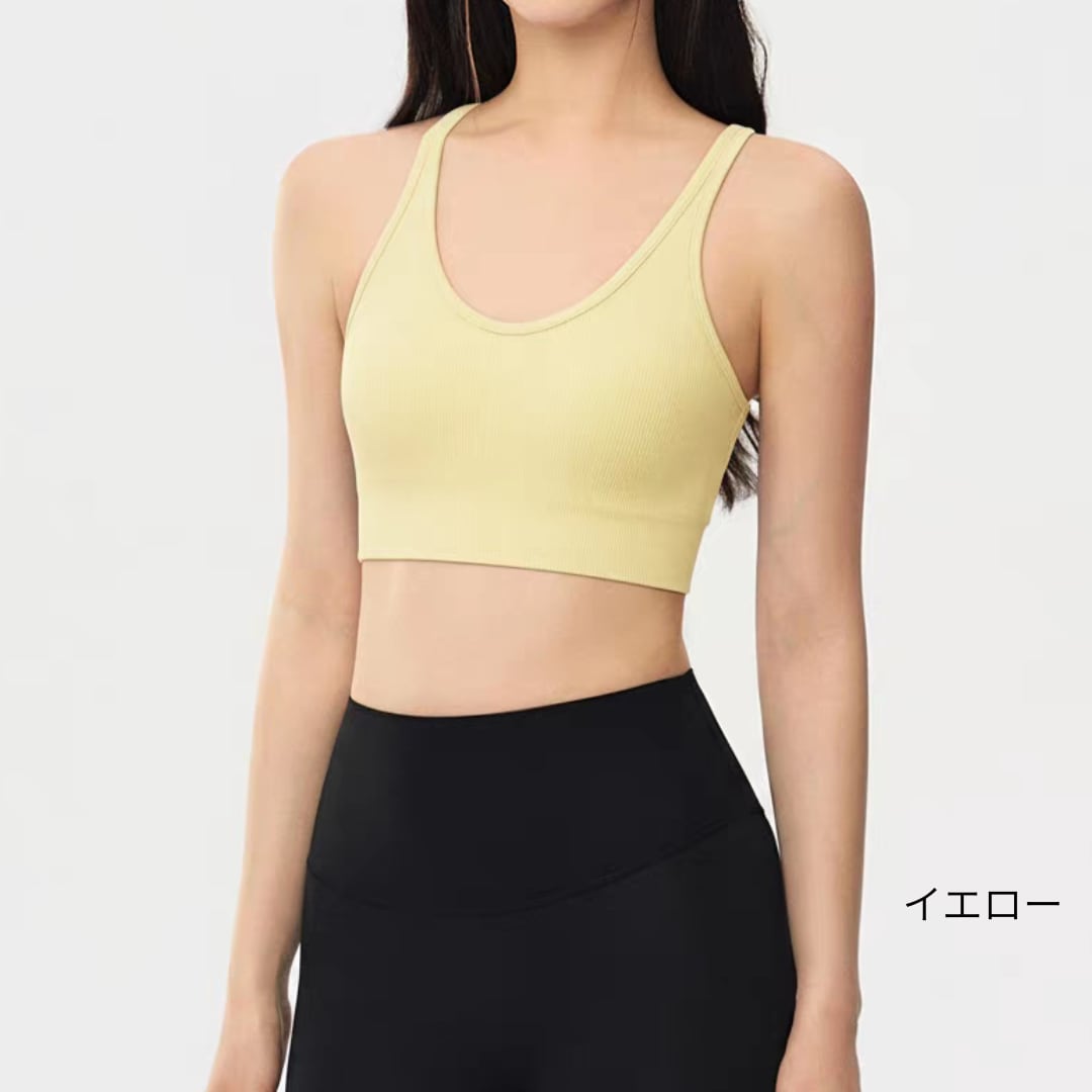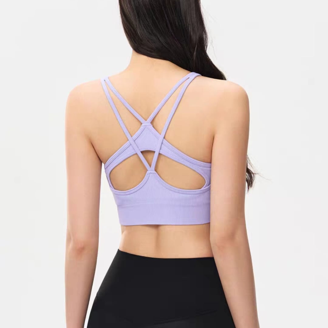 シンプルなフロントデザインに、背中を美しく見せるクロスストラップを組み合わせたリブ素材のスポーツブラ。