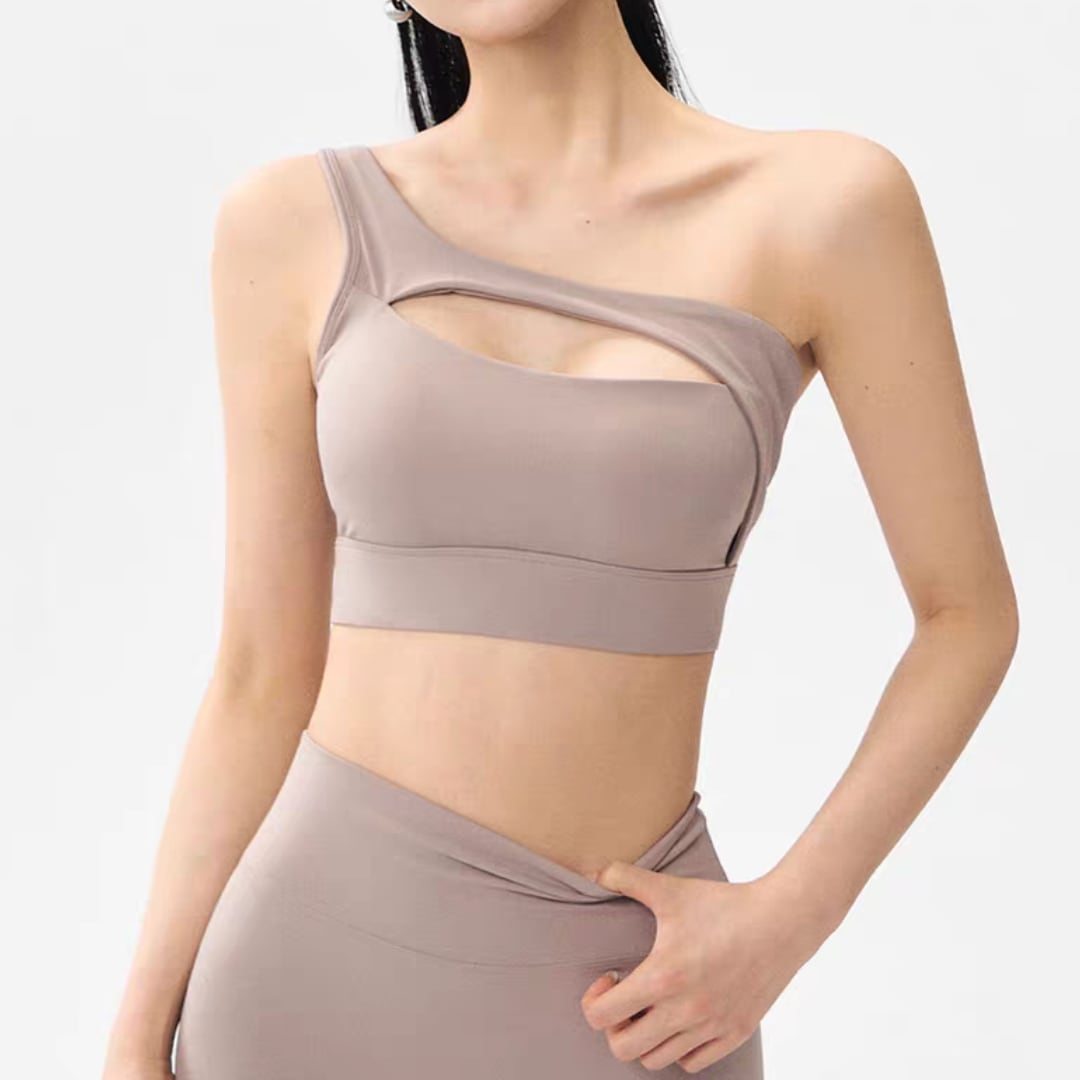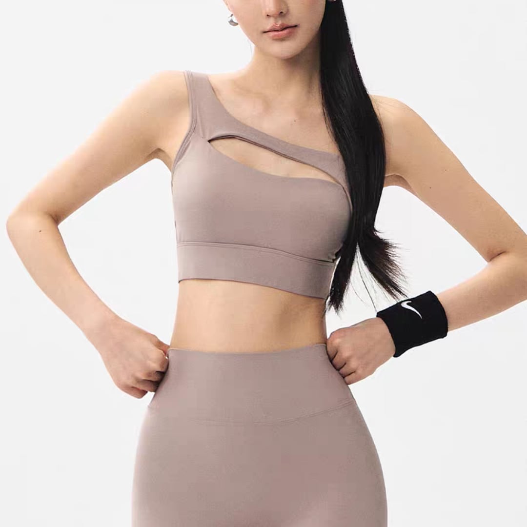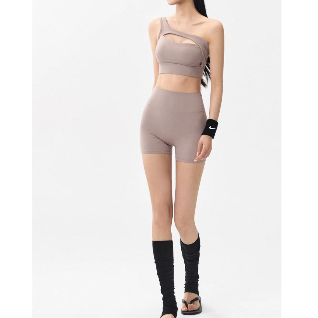 ワンショルダー×カットデザインで、洗練された大人のフィットネススタイルを演出します。