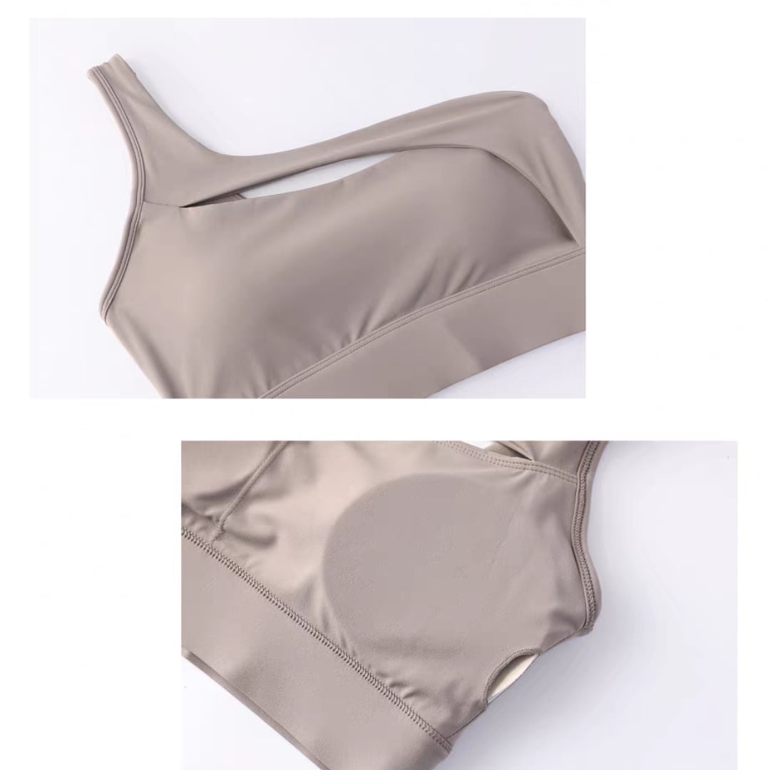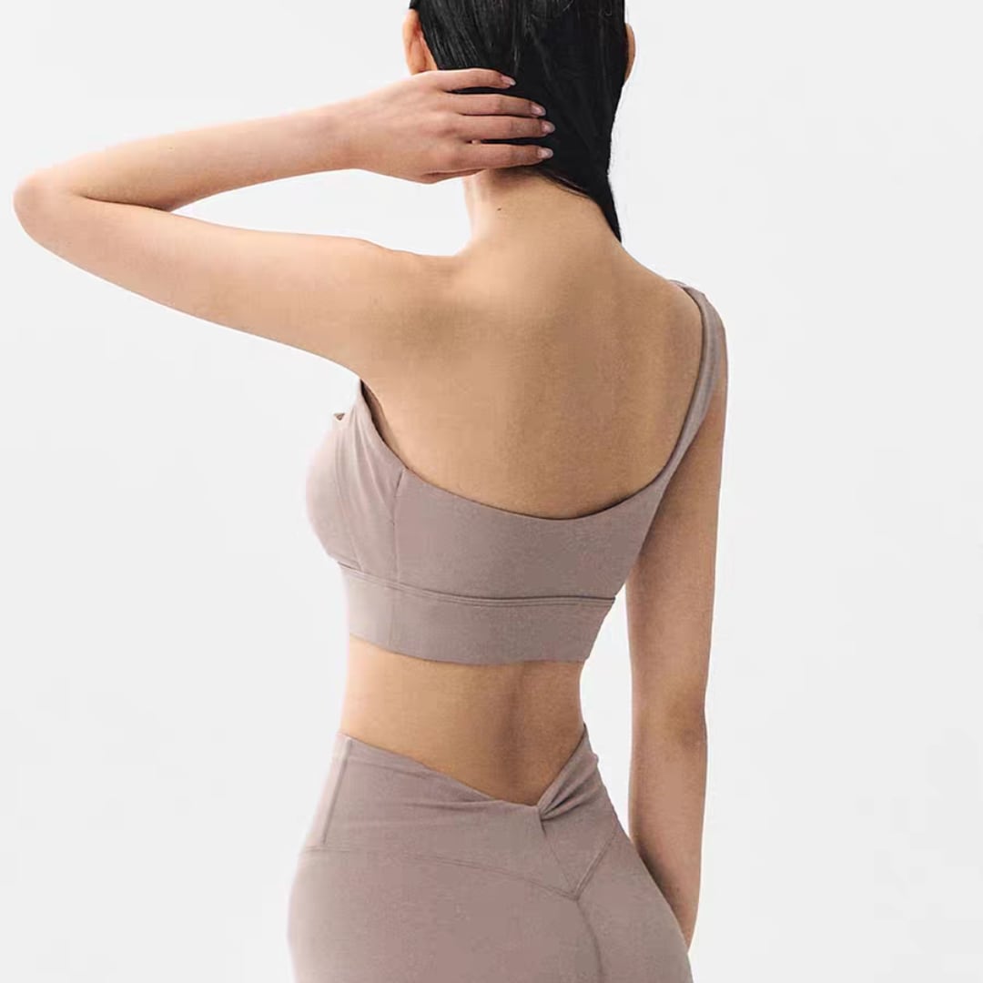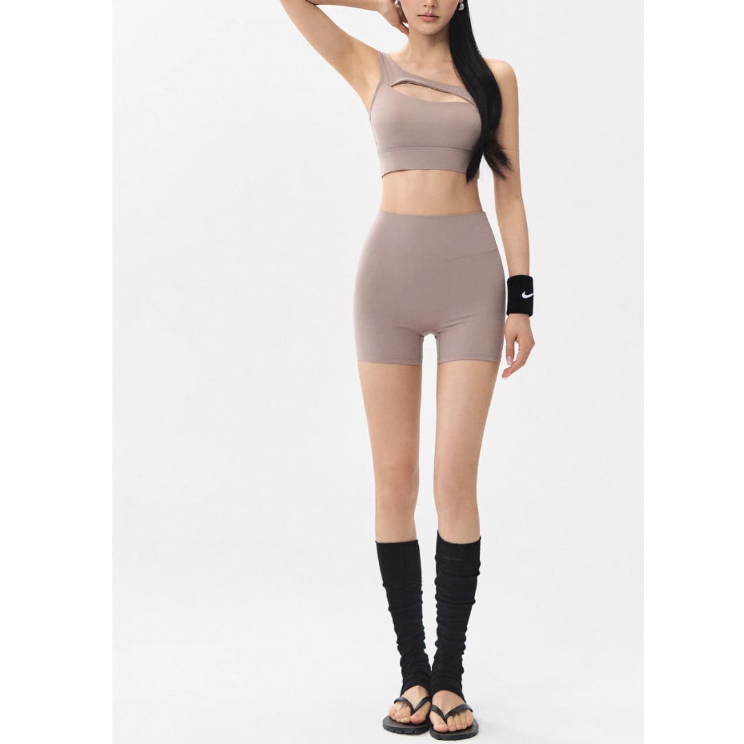 ワンショルダー×カットデザインで、洗練された大人のフィットネススタイルを演出します。